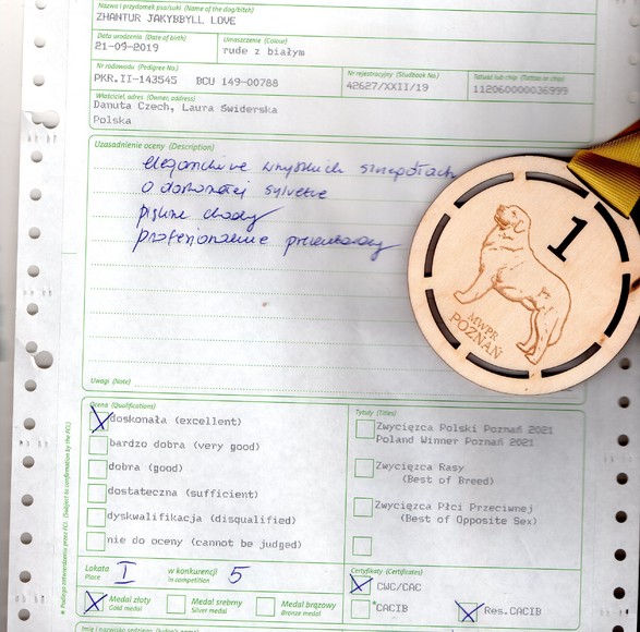 Międzynarodowa Wystawa Psów Rasowych-Zwycięzca Polski 2021 Poznań 14.11.2021 ZHANTUR JAKYBBTLL LOVE- RUDIK 1/5 PIERWSZE MIEJSCE OCENA DOSKONALA CWC RES CACIB